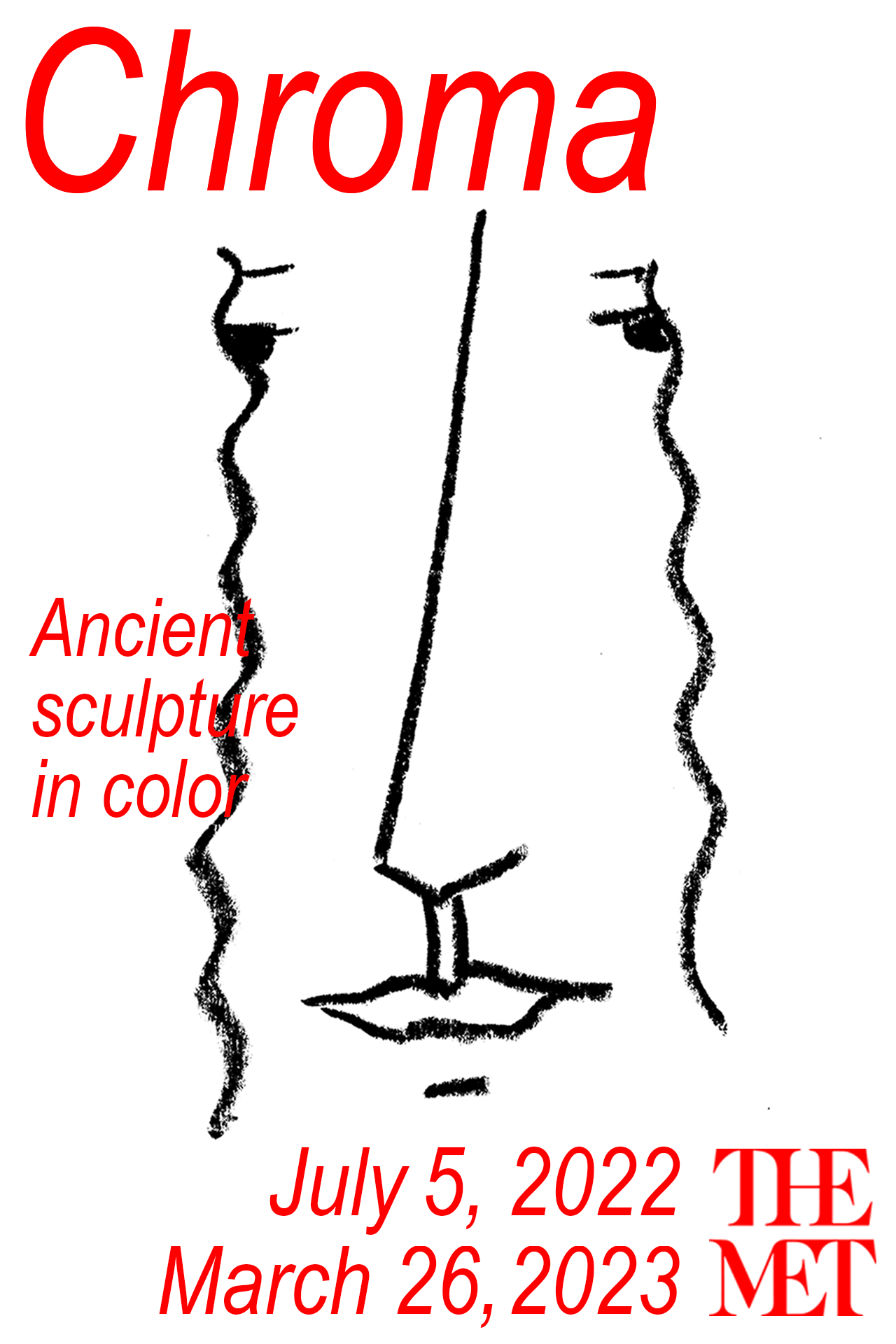 This poster combines an animation of three drawings of an ancient looking sculpture, together with a striking red color to approach the theme of the exhibition in a modern and playful way.