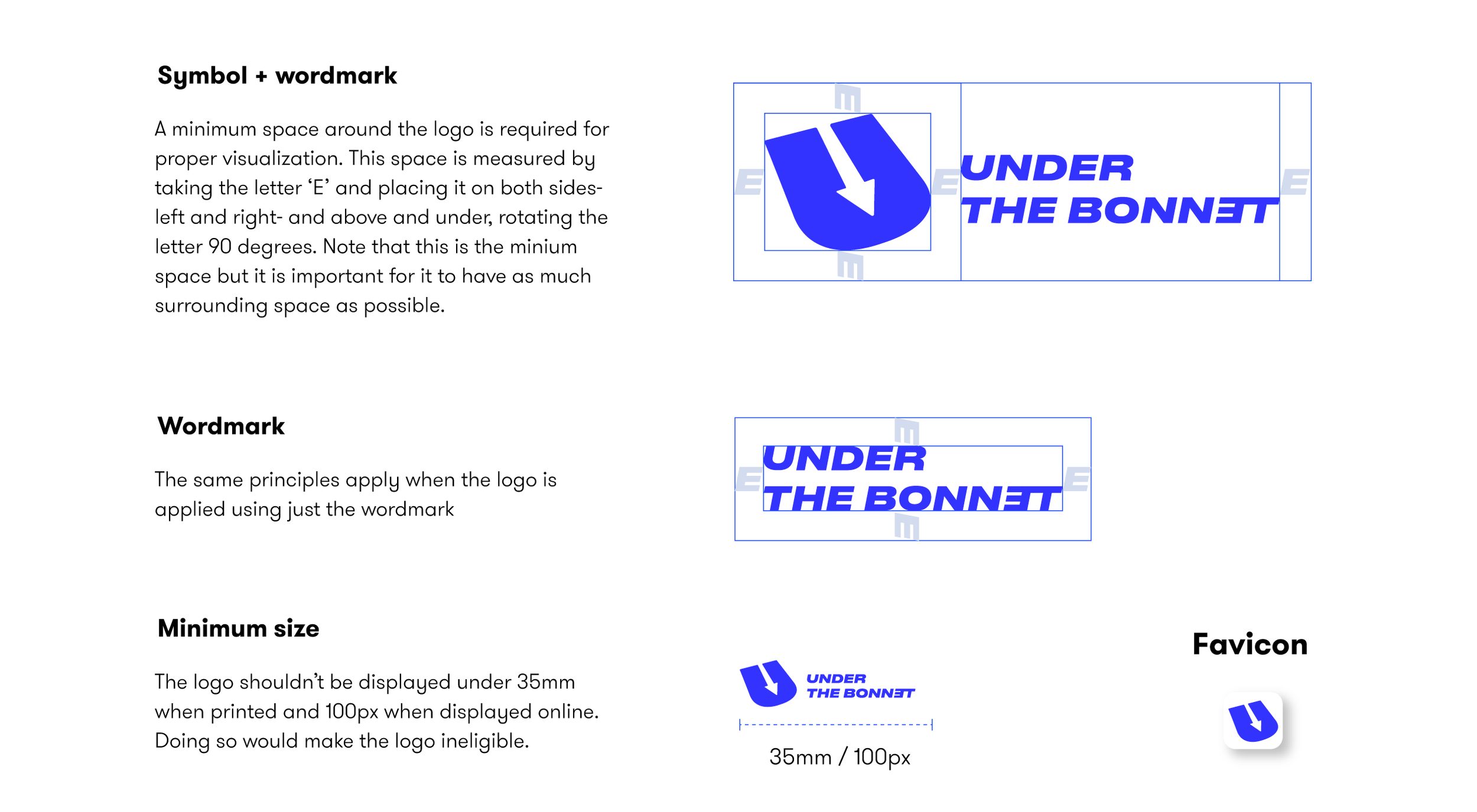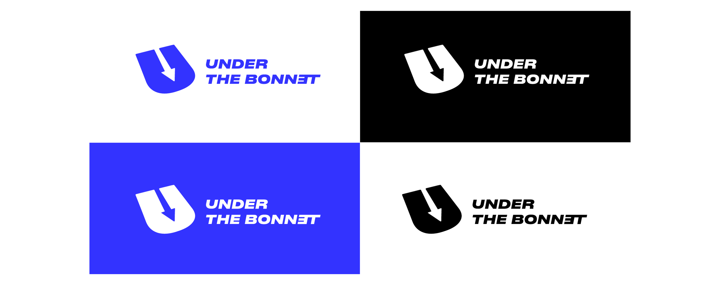 The original font is ‘Druk Wide Heavy Italic’. The original font has been tweaked to be unique and to align to the brand’s values. Its heavy version creates balance with the symbol while representing boldness and bravery, key principles that describe ‘Under The Bonnet’. The ‘Italic’ version is a metaphor of looking to the future and openness to collaboration.